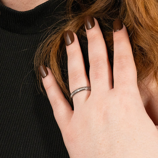 Your ring is sealed with an invisible sealant, but just know - since Meteorite is composed mostly of iron- oxidation and rusting are always possible. Exposure to oxidizing agents such as chlorine, bleach or salt can change the pH of the Meteorite and increase chances of rusting. So can prolonged submersion in water! Chemicals found in household cleaners, pools, hot tubs and even salt water should be avoided. And don't take this lady swimming.